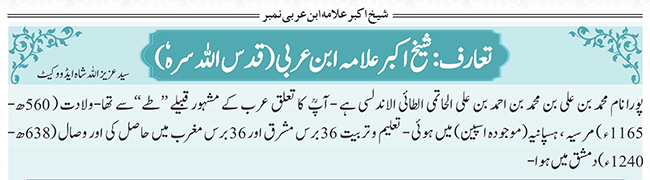 پورا نام محمد بن علی بن محمد بن احمد بن علی الحاتمی الطائی الاندلسی ہے -آپؒ کا تعلق عرب کے مشہور قبیلے ’’طے‘‘سے تھا-ولادت ( 560ھ- 1165ء ) مرسیہ ، ...