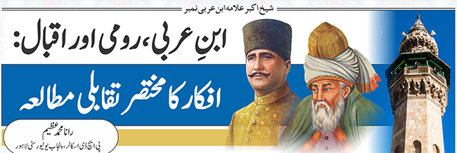 مذکورہ بالا برگزیدہ شخصیات کی وسیع تعلیمات کے اس مختصر مطالعہ سے بخوبی عیاں ہوتا ہے کہ ان کی پیش کردہ تعلیم و تلقین میں واضح مماثلت پائی جاتی ہے- عصر حاضر میں انسانیت مادیت کے چنگل میں بھٹک رہی ہے اور تہذیبیں ظاہری ترقی کے باوجود باطنی ویرانی و انتشار کا شکار ہیں- ایسے حالات میں ابنِ عربیؒ کی معنویت، مولانا رومیؒ کا عشق اور علامہ محمد اقبالؒ کی خودی ایک ایسے سہ رخی مینار کی مانند ہیں جو تاریکی میں روشنی اور بے سمتی میں سمت متعین کرتے ہیں اور ہمیں یاد دلاتے ہیں کہ انسان کا جسم مٹی سے ہے، مگر اس کی روح نور ہے اور یہی نور اس کے عروج کا راز ہے- اصل انسان وہ ہے جو روحانی طور پر بیدار ہو، عشق سے معمور ہو اور کائنات میں اللہ کی خلافت کا شعور رکھتا ہو-