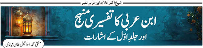 شیخ محی الدین ابن عربیؒ آیات کی تاویل میں روحانی اشارات تلاش کرتے ہیں آپؒ کی بنیادیں دراصل عارفانہ نظریات، وحدت الوجود کے فہم اور باطنی معانی تک رسائی کے اصول پر قائم ہیں- ان کی تفسیر میں قرآن کے ظاہر (لفظی معنی) کو ترک نہیں کیا جاتا، بلکہ اس کے پیچھے چھپے روحانی و عرفانی معانی کو ظاہر کیا جاتا ہے-
